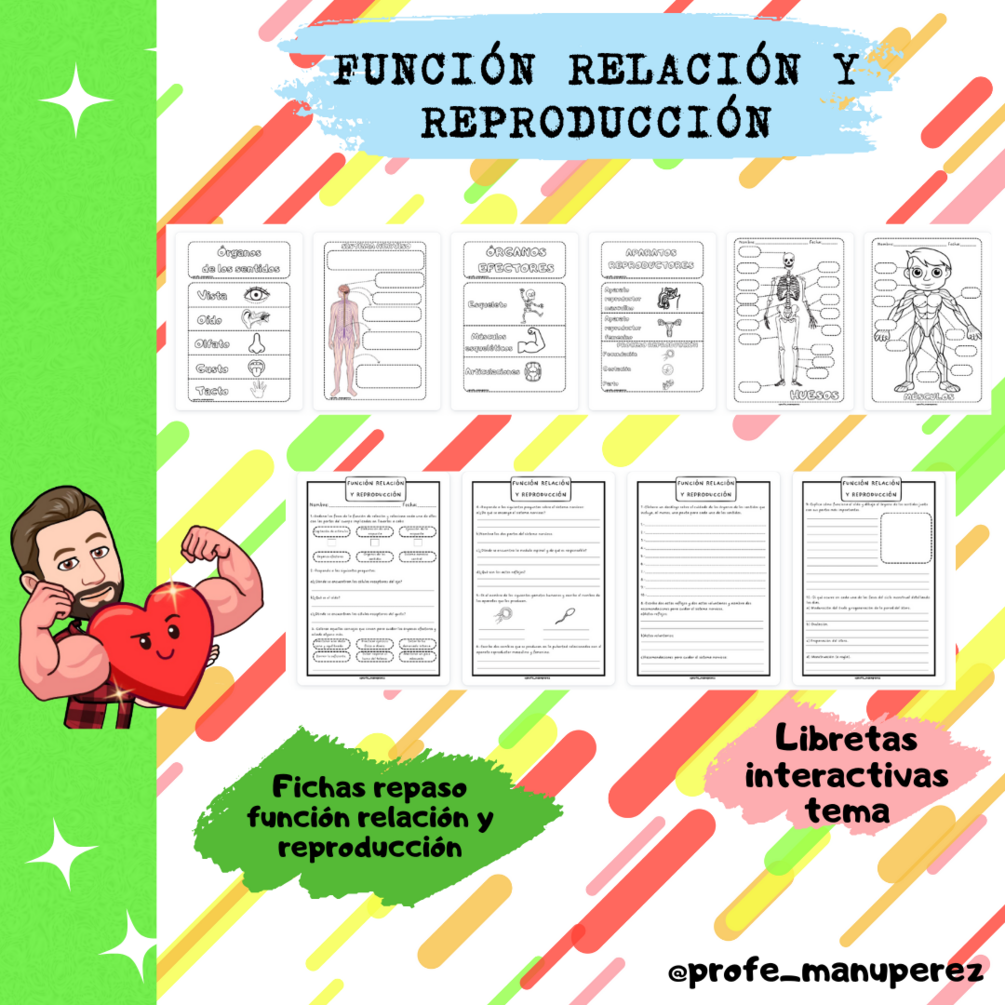 Contiene flipbook para libreta interactiva de los diferentes apartados del tema. Además, ficha de repaso de la función de relación y reproducción, ficha de huesos y músculos y ficha sobre los sentidos para rellenar.